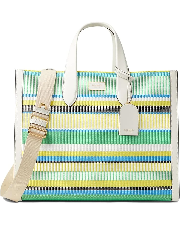 - Redefine your casual look according to your mood by carrying the stylish and spacious Kate Spade New York® Manhattan Striped Woven Straw Large Tote Bag. The lightweight tote bag features two shoulder straps, leather license plate logo detail with clasp closure, one interior zip pocket, one interior slip pocket, and an attractive striped pattern.
