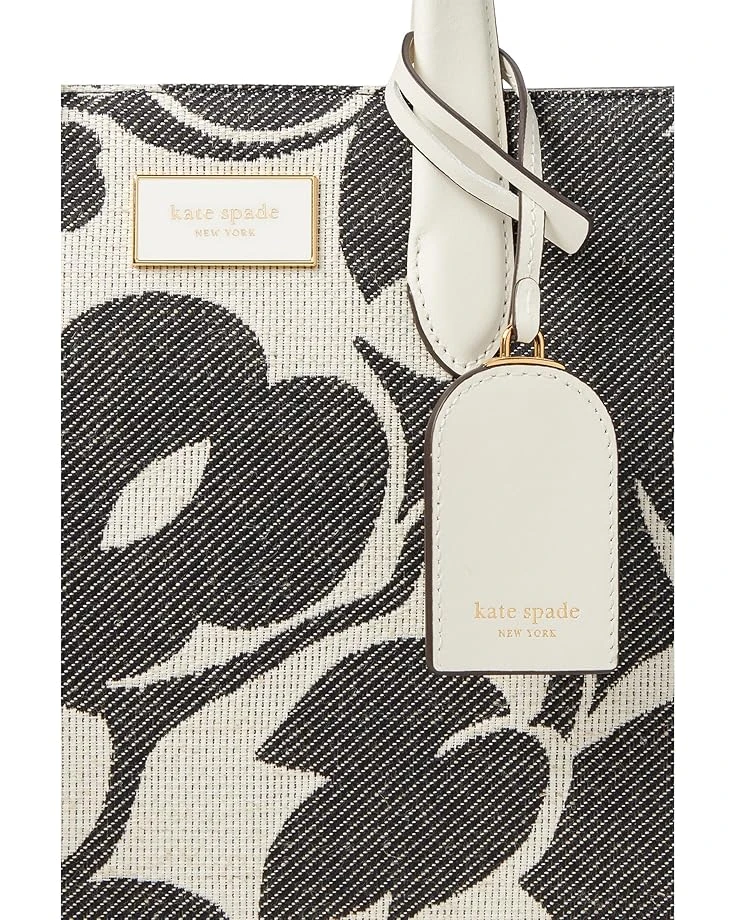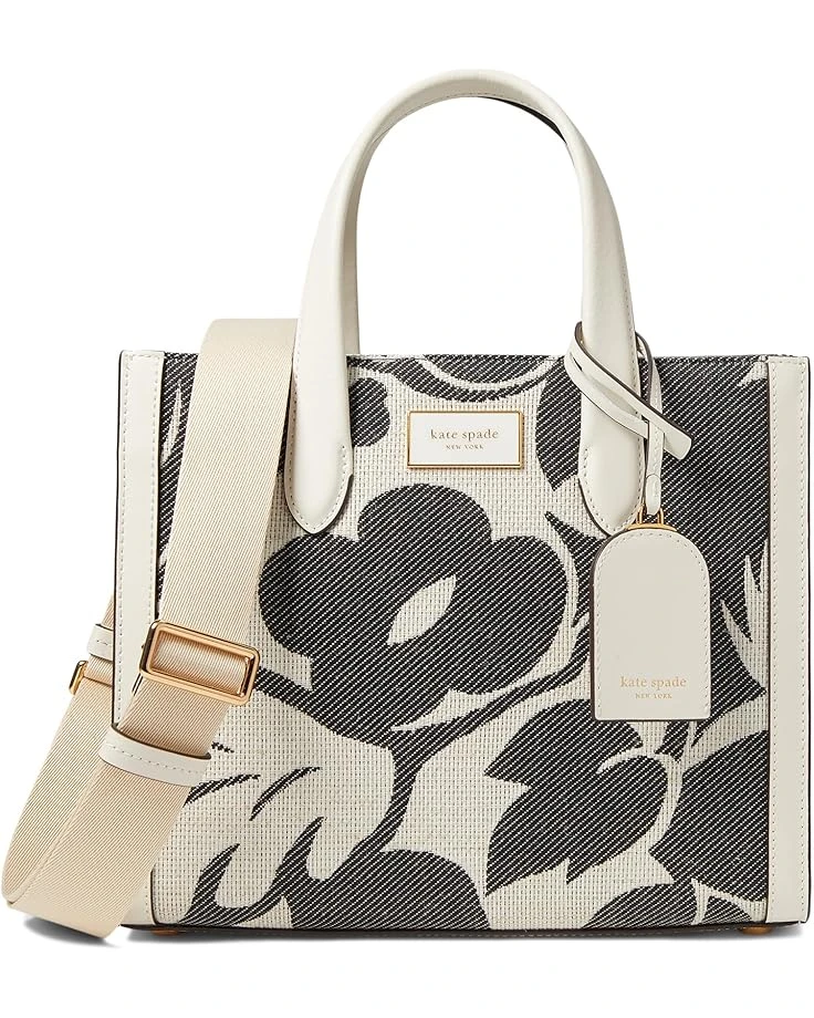 - Dress with purpose carrying the Kate Spade New York® Manhattan Tropical Foliage Canvas Jacquard Small Tote. Crafted from leather, this bag features open top silhouette, dog-clip closure, two top carry handles and one detachable/adjustable crossbody strap. This bag has smooth leather trim, pinmount logo on the front, one zippered interior pocket and one interior snap pocket.
