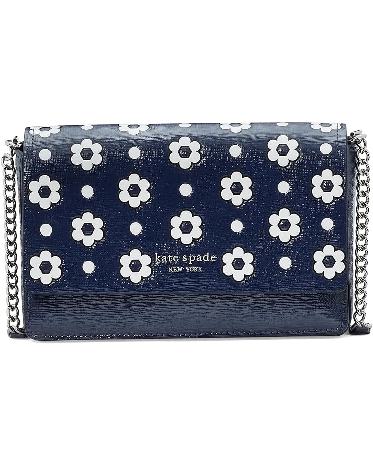 - Travel smart yet stylish carrying the Kate Spade New York® Morgan Daisy Dot Embossed Saffiano Leather Flap Chain Wallet. It has one main compartment with a floral embossed flap featuring a magnetic snap closure. The interior features a zippered pocket with two slip pockets and card slots for easy organization.
