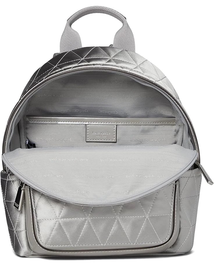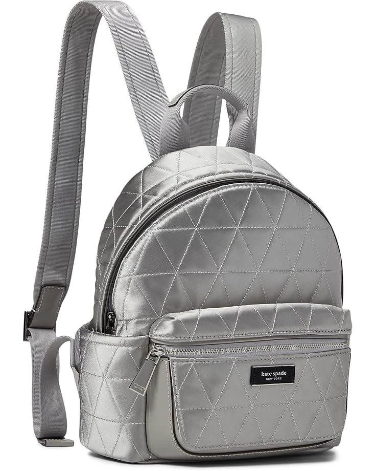 - Explore the world carrying the fashionable and functional Kate Spade New York® Sam Icon Quilted Satin Small Backpack. Crafted from textile, this classy backpack features one top carry handle, zippered closure, dual adjustable shoulder straps, and one zippered exterior pocket on the front. It has one interior back wall slip, and two exterior slip pockets.