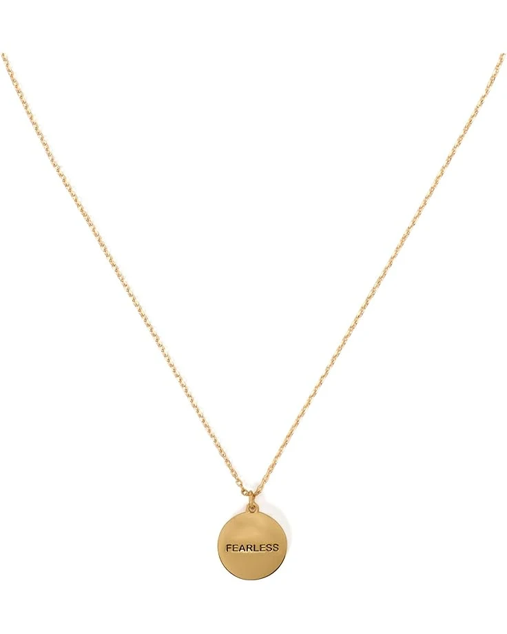 - Take your style statement to the next level wearing Kate Spade New York® The Color Spark Collection Blue Confidence Medallion Necklace. Designed with brass material and cubic zirconia stones, the pendant necklace features “Fearless” engraving and has a lobster clasp closure for easy on/off.