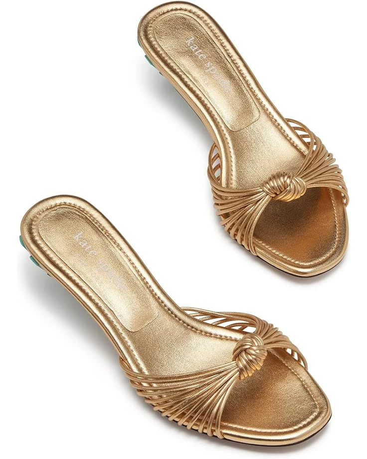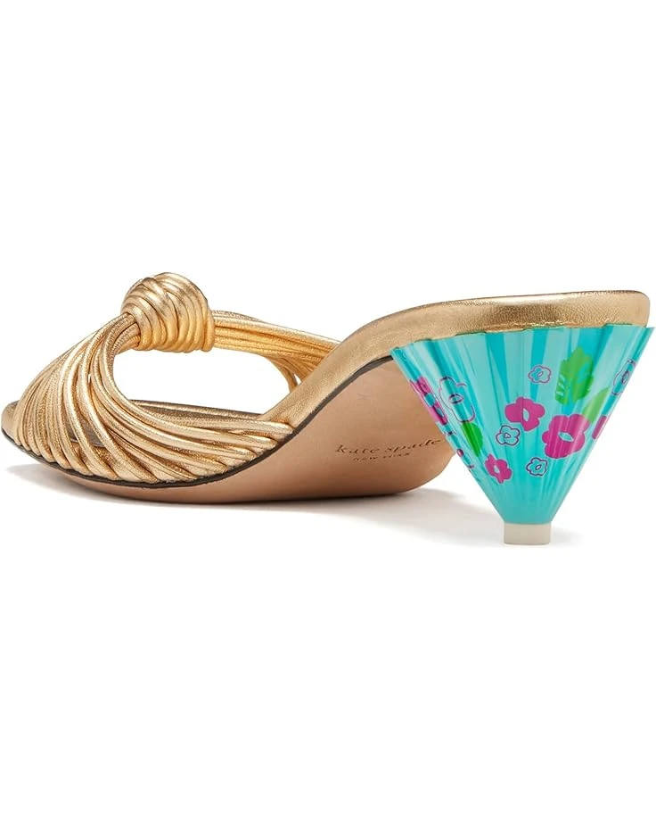 - A pyramid-inspired contrasting cone heel offers a colorful and captivating look to the Kate Spade New York® Tiki Sandal. The slip-on footwear features leather upper construction with knotted detail on the vamp and open toe silhouette.